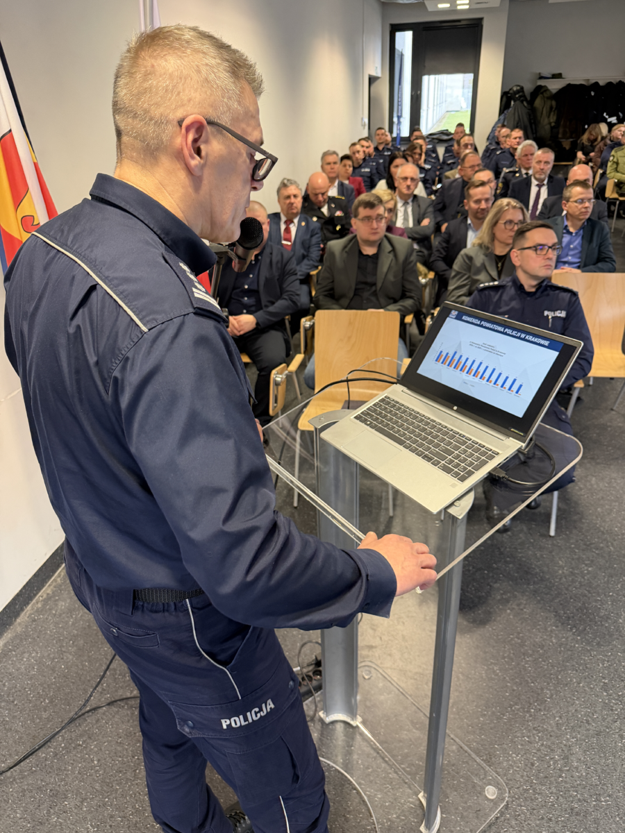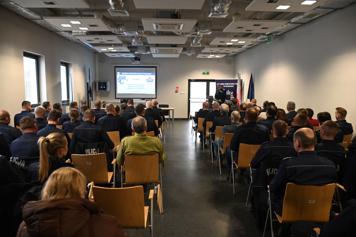 28 stycznia br. w siedzibie Oddziału Prewencji Policji w Krakowie, Komenda Powiatowa Policji w Krakowie podsumowała ubiegły, 2025 rok. W naradzie uczestniczył Komendant Wojewódzki Policji w Krakowie nadinsp. Artur Bednarek, Starosta Krakowski Pani Elżbieta Burtan, przedstawiciele samorządów, szefowie służb współpracujących z krakowską powiatówką, szefowie Prokuratur oraz kadra kierownicza, funkcjonariusze i pracownicy i przedstawiciele związków zawodowych Komendy Powiatowej Policji w Krakowie i podległych Komisariatów.