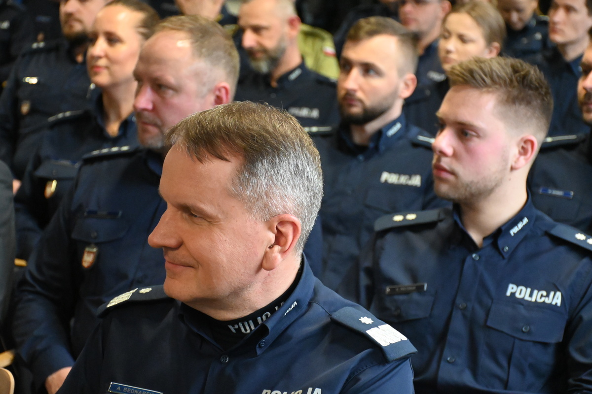 Po tych wystąpieniach głos zabrał Komendant Wojewódzki Policji w Krakowie nadinsp. Artur Bednarek, który podkreślił, że Komenda Powiatowa Policji w Krakowie jest bardzo dużą jednostką z całkiem sporym terenem, który wymaga ogromnej pracy i zaangażowania na rzecz bezpieczeństwa. Szef garnizonu małopolskiego zaznaczył, że jesteśmy jednym z czterech powiatów, w którym licznie przybywa nowych mieszkańców, co świadczy o wysokim poziomie bezpieczeństwa. Następnie podsumował obszary przestępczości kryminalnej, prewencji i ruchu drogowego na terenie naszego powiatu. Kolejno skierował słowa do wszystkich policjantów i policjantek dotyczące etyki zawodowej i dyscypliny służbowej. Na zakończenie Komendant Wojewódzki dobrze ocenił pracę funkcjonariuszy Komendy Powiatowej Policji w Krakowie oraz życzył wszystkim policjantom wielu sukcesów w 2026 roku, szczęścia i zadowolenia oraz efektywnej służby na rzecz mieszkańców powiatu krakowskiego.