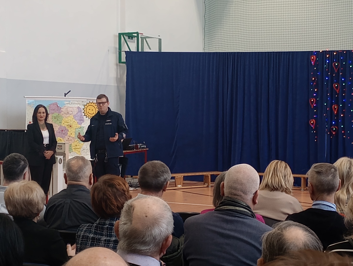 Funkcjonariusz przypominał o najczęściej stosowanych metodach oszustw wymierzonych w osoby starsze, apelując o ostrożność, rozwagę i ograniczone zaufanie wobec nieznajomych. Mundurowy nawiązał także do kampanii społecznej pn. „Ustal z Babcią hasło”, zachęcając seniorów, aby wspólnie z bliskimi ustalili proste, znane tylko najbliższej rodzinie hasło lub zwrot, który w razie niespodziewanego telefonu od oszustów pozwoli szybko zweryfikować z kim rozmawiamy. Nie zabrakło też rozmów na temat bezpieczeństwa w ruchu drogowym, prawidłowym poruszaniu się pieszych, noszeniu odblasków po zmroku oraz o zagrożeniach związanych z zimą i niskimi temperaturami. Funkcjonariusz z dużym zaangażowaniem przedstawił uczestnikom wszystkie tematy, włączając również swoje osobiste doświadczenia ze służby oraz przykłady różnych zdarzeń, co wpłynęło na niezwykle ciekawą i pouczającą prelekcję. Na zakończenie policjant skierował do seniorów życzenia zdrowia oraz wszelkiej pomyślności z okazji ich święta, a także rozdał materiały edukacyjne, które przypominają o zasadach bezpieczeństwa.