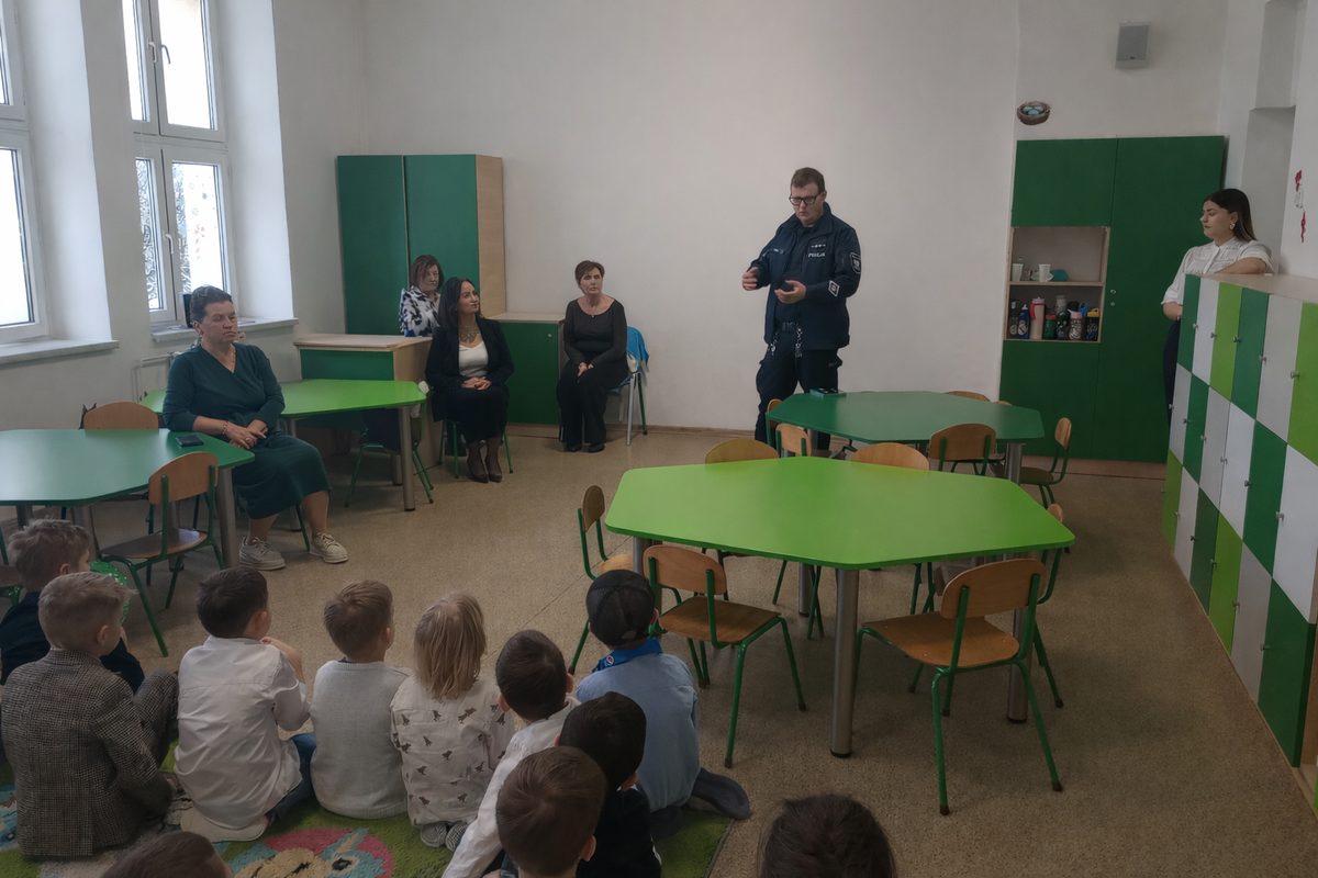 Pod koniec stycznia obchodziliśmy Dzień Babci i Dzień Dziadka. Seniorzy przybyli w tych dniach do przedszkoli, aby świętować wspólnie ze swoimi wnukami. Była to doskonała okazja do zorganizowania spotkania profilaktycznego z policjantem.