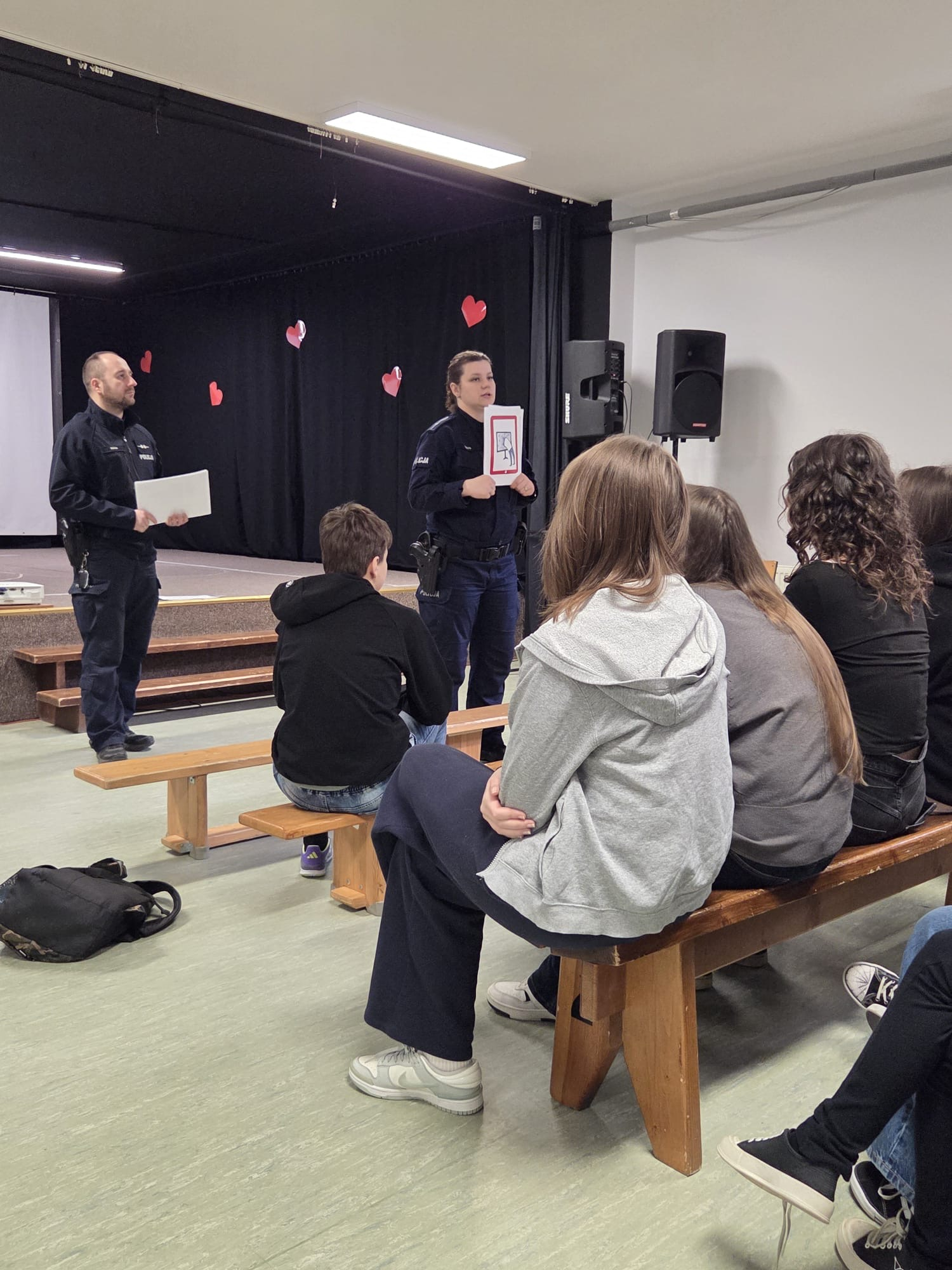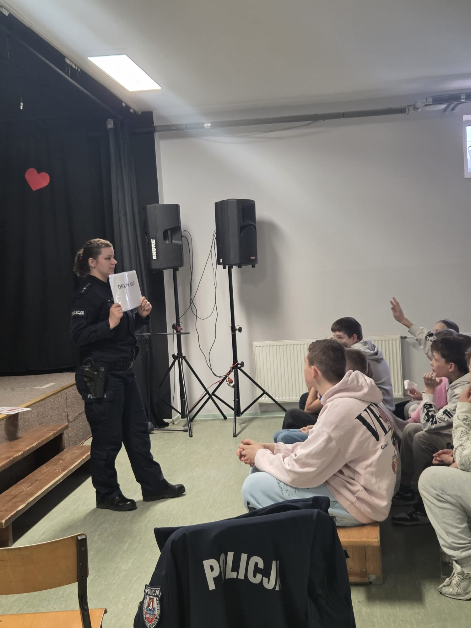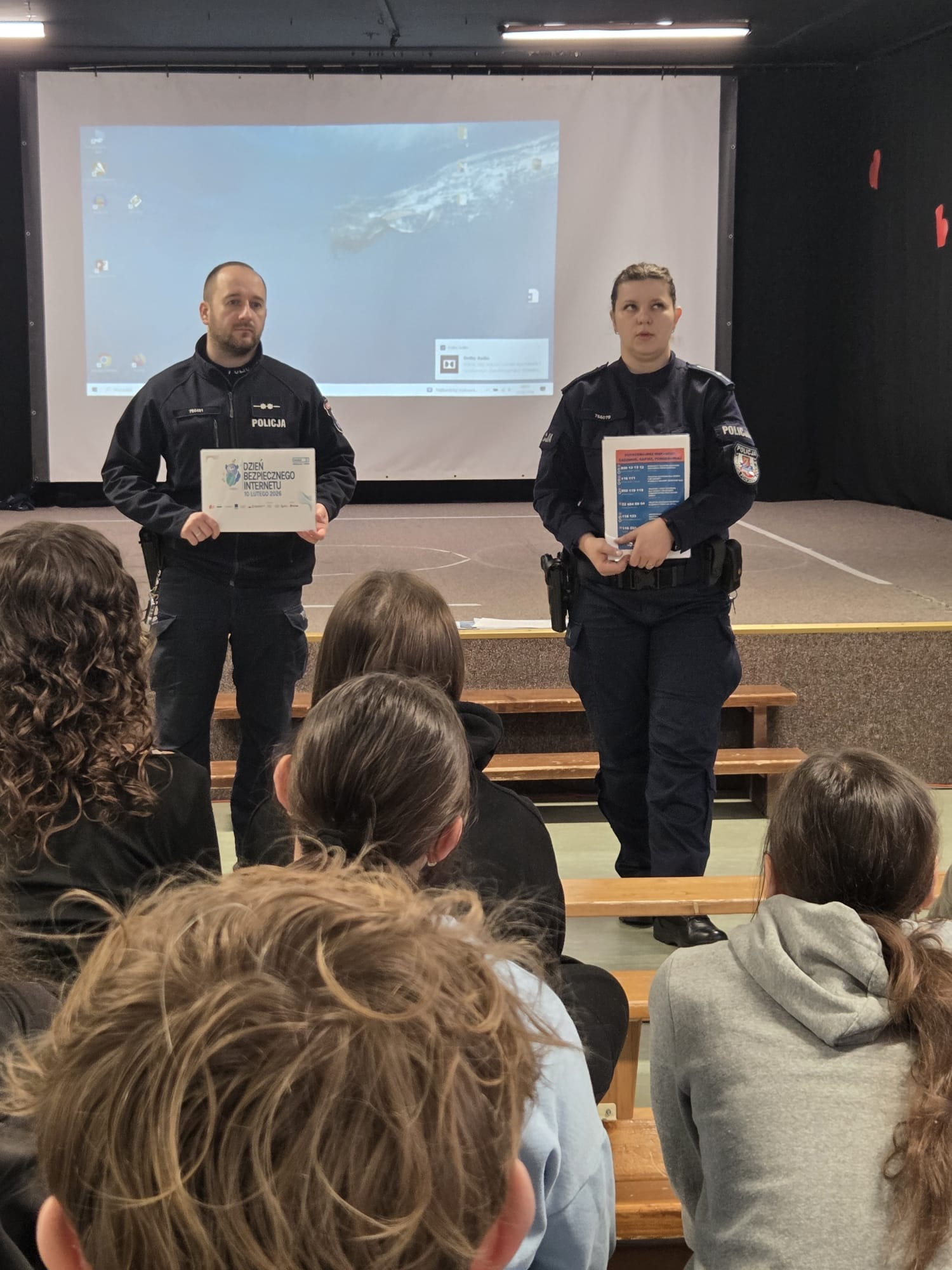 Kolejnego dnia na uczniów czekała dawka wiedzy dotycząca cyberzagrożeń. Policjanci nawiązali w swojej prelekcji do „Dnia Bezpiecznego Interentu” – to międzynarodowa inicjatywa Komisji Europejskiej, której przedmiotem działań jest rozwój kompetencji cyfrowych dzieci i młodzieży oraz promowanie bezpiecznego, odpowiedzialnego korzystania z internetu. W tym roku kampania związana z tym tematem rozpoczęła się 10 lutego i potrwa do końca marca. Omówione zostały najważniejsze zagrożenia oraz jak ich unikać czyli cyberprzemoc, manipulacja emocjonalna, niebezpieczne znajomości, uzależnienie od Internetu czy niekontrolowane i nadmierne udostępnianie swojego wizerunku. Uczestnicy poznali „Dekalog cyfrowego obywatela” czyli prawa i obowiązki dla korzystających z sieci. Policjantka poruszała także bardzo ważne kwestie związane z agresją i hejtem. Uczulała, że zamieszczanie niewłaściwych, agresywnych lub obraźliwych komentarzy w Internecie podlega odpowiedzialności karnej, a wszystko w sieci zostawia swój ślad. Czasami jedno słowo, nieprzychylny komentarz, wrzucone do sieci zdjęcie lub film może wyrządzić komuś olbrzymią krzywdę. Konsekwencje takich zachowań bywają tragiczne w skutkach dla młodych ludzi. Dodatkowo z uczniami klas VIII mundurowi rozmawiali na temat handlu ludźmi. Uczesnicy dowiedzieli się czym jest to zjawisko, jakie zachowania świadczą o tym procederze oraz jakie są formy handlu ludźmi. Funkcjonariusze w sposób jasny i zrozumiały przybliżyli kwestie z tym związane, w tym także odpowiedzialność karną za to przestępstwo, a także w jakich sytuacjach powinna nam „zapalić się czerwona lampka”. Policjanci przybliżyli młodzieży przykłady konkretnych spraw i okoliczności co spotkało się z dużym zaciekawieniem. W szkole, w miejscach ogólnodostępnych zostawiono broszury edukacyjne z treściami dotyczącymi omawianej tematyki.