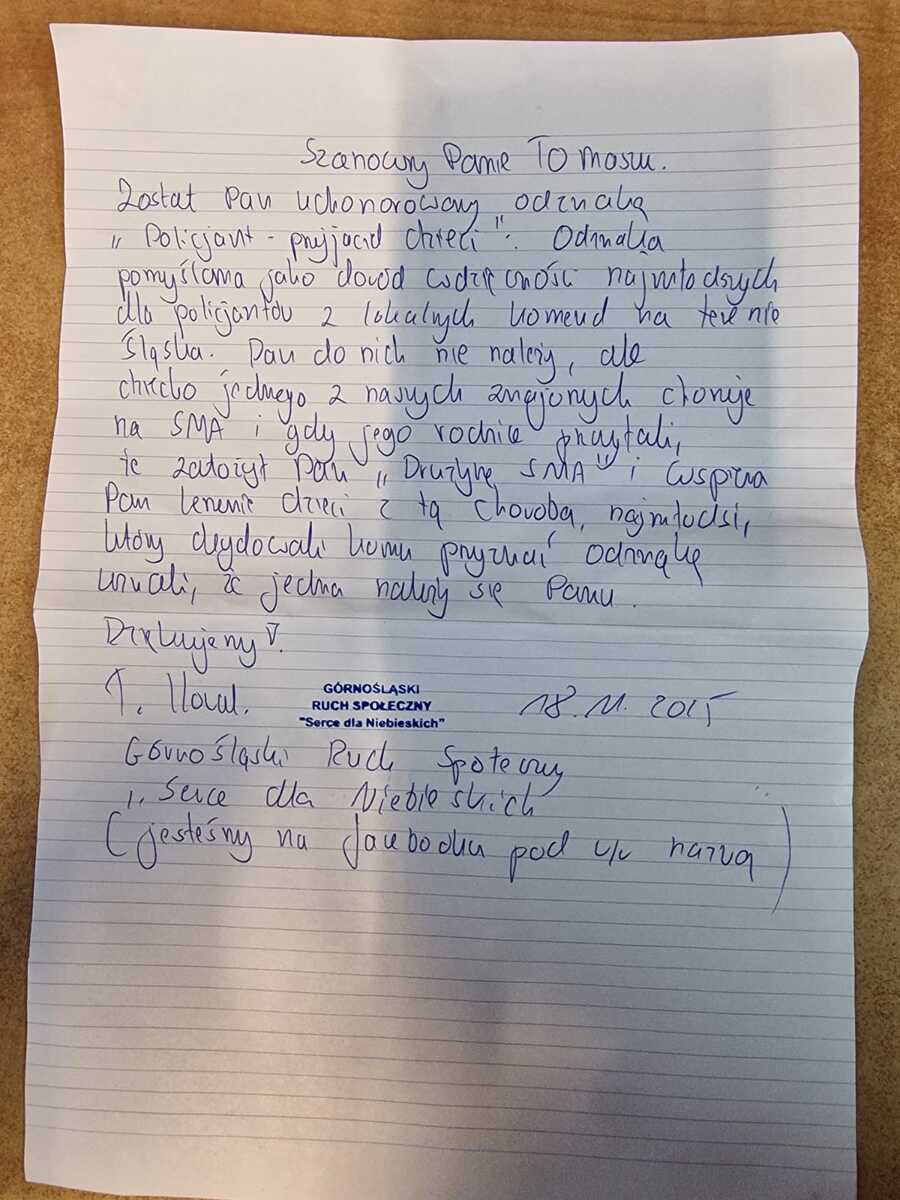 W 2025 roku został wyróżniony przez Górnośląski Ruch Społeczny „Serce dla Niebieskich” jako jedyna w historii osoba spoza Śląska, która otrzymała odznakę „POLICJANT PRZYJACIEL DZIECI”.