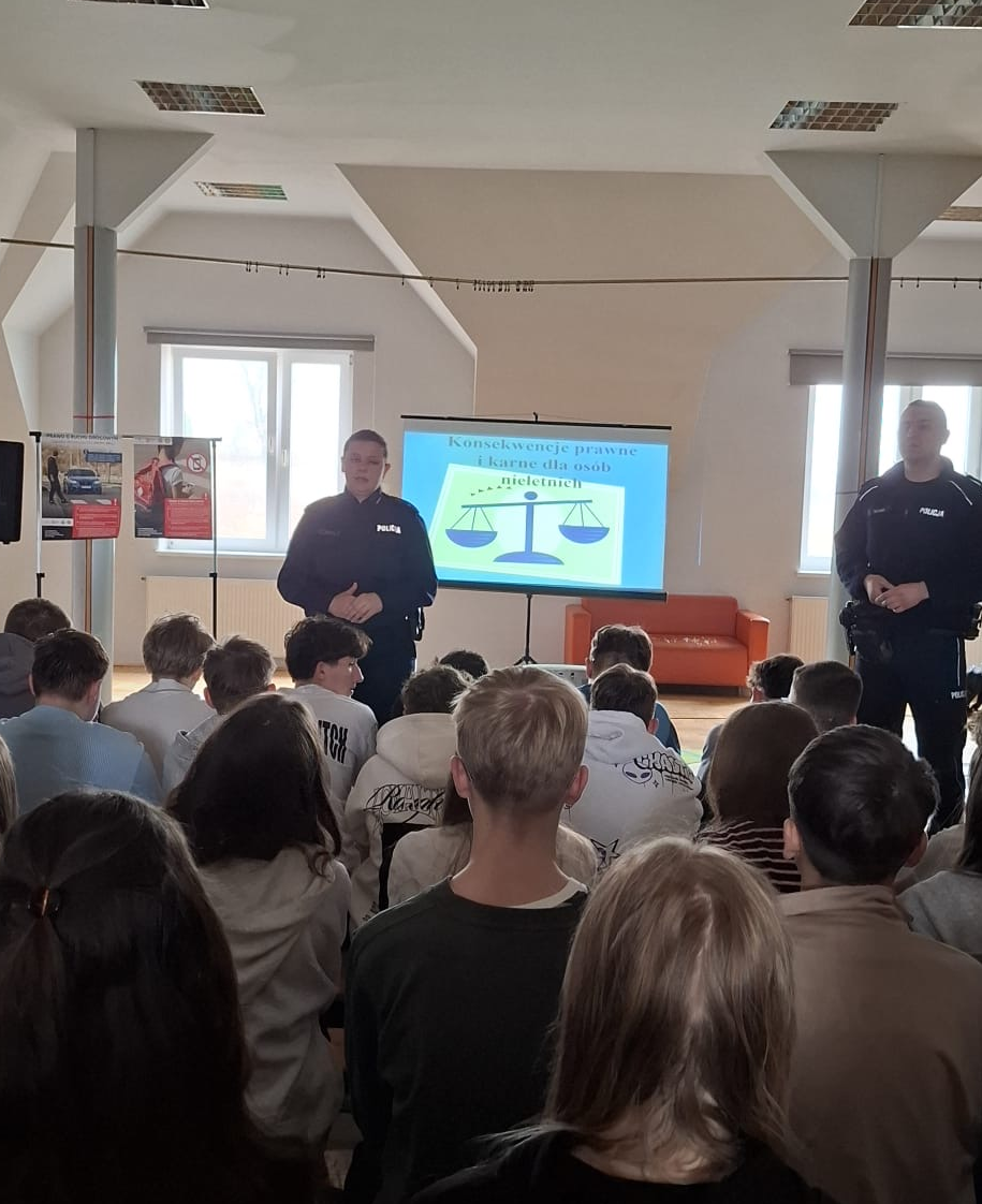 Kolejnym tematem była odpowiedzialność prawna nieletnich, jakie mogą być konsekwencje popełnionych czynów karalnych oraz jakie środki może wobec nieletniego zastosować Sąd. W ramach projektu pod nazwą "Powiedz NIE uzależNIEniom", funkcjonariusze poruszyli kwestie związane z używkami, e-papierosami, alkoholem, piciem napojów energetycznych, brania snusów czy narkotyków. Zwrócili uwagę, że zażywanie używek, w tym narkotyków, dopalaczy oraz alkoholu, niesie za sobą szereg negatywnych konsekwencji, które obejmują sferę zdrowotną, psychiczną, społeczną oraz prawną. Substancje psychoaktywne prowadzą do zmian w funkcjonowaniu organizmu, uzależnienia, a w skrajnych przypadkach do śmierci.