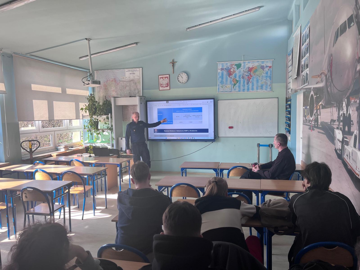 18 marca br. w Zespole Szkół Ponadpodstawowych w Giebułtowie odbyło się spotkanie uczniów klas maturalnych z Komendantem Komisariatu Policji w Zielonkach kom. Krzysztofem Kubickim i Kierownikiem Posterunku Policji w Białym Kościele asp. Dawidem Sarotą. Wydarzenie zostało zorganizowane w ramach działań promujących służbę w Policji.