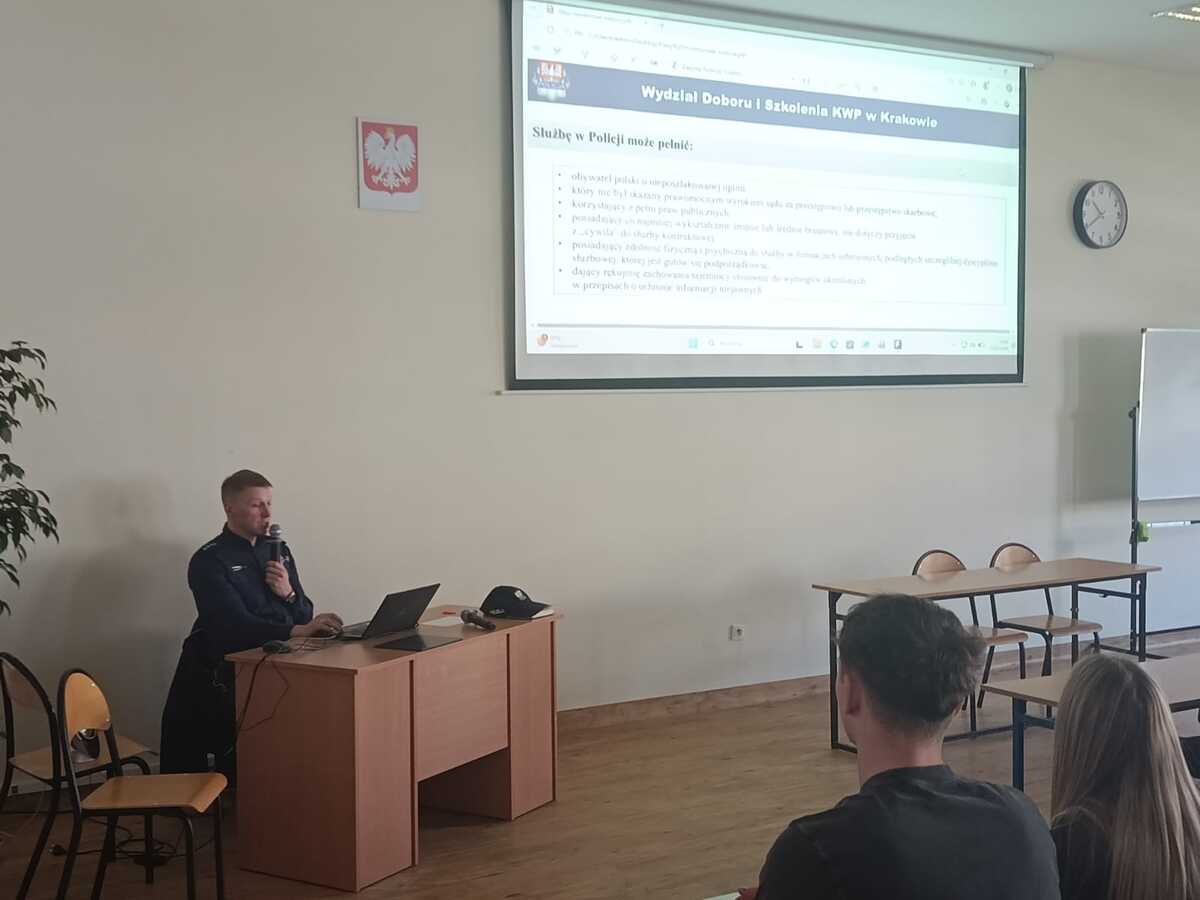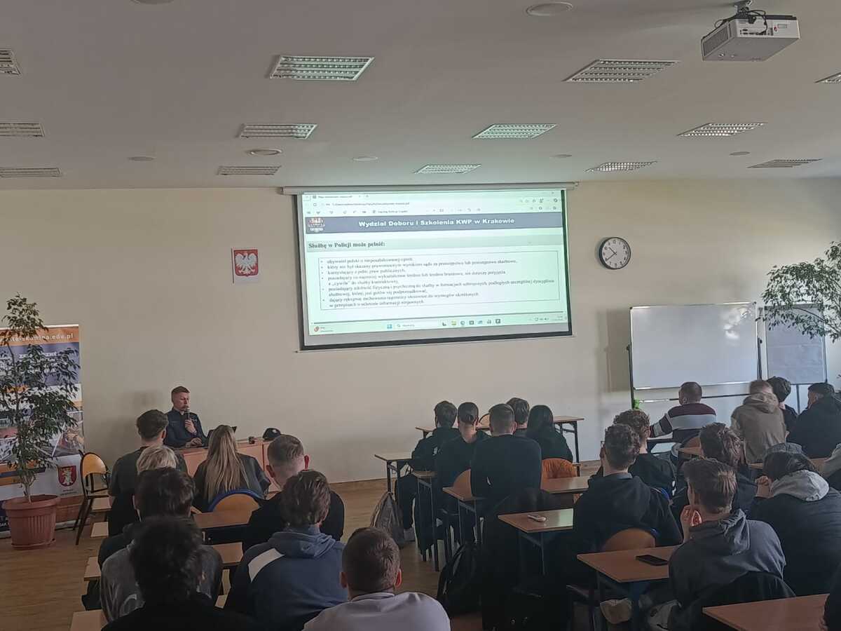 Podczas spotkania funkcjonariusze przedstawili poszczególne etapy kwalifikacji do służby w Policji oraz wymogi jakie muszą spełniać kandydaci chcący wstąpić w szeregi Policji. Przyszłym maturzystom przybliżono charakterystykę służby policjanta, możliwości rozwoju zawodowego oraz przekazano informacje odnośnie wysokości zarobków funkcjonariuszy. Zastępca Komendanta Komisariatu Policji w Skawinie przedstawił maturzystom cały proces rekrutacji i szczegółowo omówił każdy jej etap. Policjanci mówili również o tym, jak na co dzień wygląda ich służba, dzieląc się z młodzieżą doświadczeniami zawodowymi. Mundurowi przybliżyli zadania Policji i pozytywne aspekty tej służby.