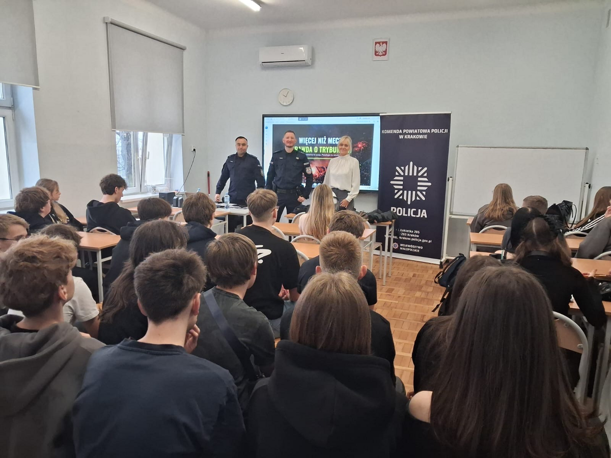 W miniony poniedziałek uczniowie klas ponadpodstawowych ze Świątnik Górnych mieli okazję wysłuchać ciekawej prelekcji na temat kibicowania. Inicjatywa ta ma na celu promowanie pozytywnych wzorców i przeciwdziałanie wandalizmowi. Wobec narastającego problemu agresji oraz chuligańskich zachowań na stadionach, które bezpośrednio rzutują na poczucie bezpieczeństwa dzieci i młodzieży policjanci przygotowali specjalne zajęcia promujące tą tematykę. Uczniowie dowiedzieli się między innymi czym jest kibicowanie oraz jakie występują przestępstwa i wykroczenia dotyczące imprez sportowych i masowych.