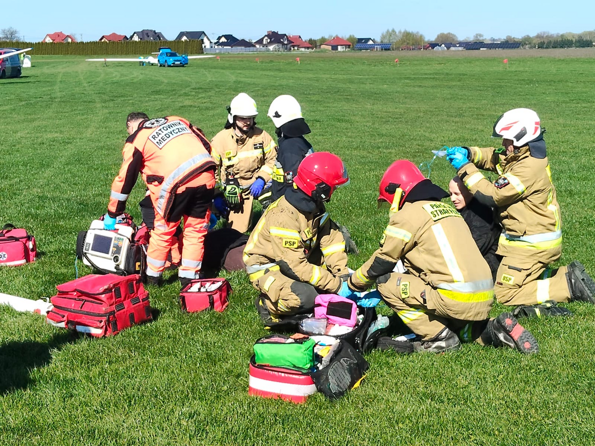 Scenariusz ćwiczeń zakładał, że na płycie postojowej na lotnisku w Pobiedniku Wielkim w trakcie uzupełniania paliwa, w wyniku nieszczelności przewodu lub nieprawidłowego uziemienia dochodzi do zapłonu oparów paliwa. Pożar powstaje w rejonie skrzydła i kadłuba samolotu. Obsługa samolotu podejmuje próbę gaszenia ognia gaśnicami proszkowymi, jednak płomienie szybko obejmują fragment kadłuba i odzież jednej z osób. Dwie osoby doznają oparzeń oraz objawów zatrucia dymem i trudności z oddychaniem. Świadkami zdarzenia są inni pracownicy aeroklubu, którzy natychmiast powiadamiają służby ratunkowe korzystając z numeru alarmowego. Po przybyciu na miejsce służby zastają sytuację, w której na płycie postojowej płonie fragment samolotu oraz rozlana benzyna lotnicza w pobliżu stanowiska tankowania. Ogień został częściowo opanowany przez personel lotniska przy użyciu gaśnic.